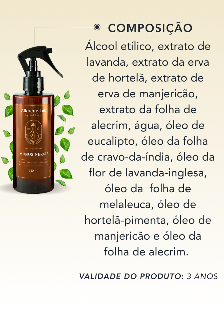✽ Nós nos orgulhamos do Spray Corporal Imunosinergia: Essências florais de alecrim (Rosmarinus officinalis), hortelã (Mentha piperita), Melaleuca alternifolia leaf oil, lavandula officinalis flower oil e associações.