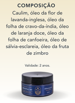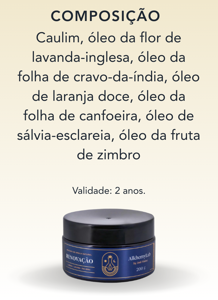 ✽ Nós nos orgulhamos da composição da nossa Máscara de Argila Natural Renovação: Caulim, Óleo da flor de Lavanda-Inglesa, Óleo da folha de Cravo-da-Índia, Óleo de Laranja Doce, Óleo da folha de Canfoeira, Óleo de Sálvia-Esclareia, Óleo da fruta de Zimbro.