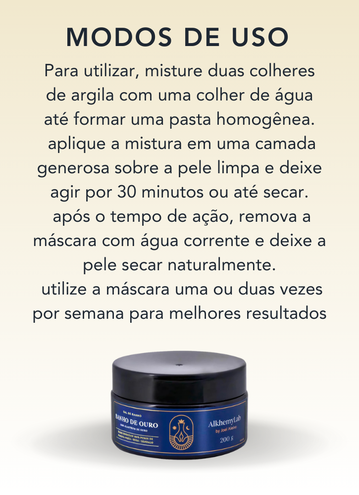 Para utilizar, misture duas colheres de argila com uma colher de água até formar uma pasta homogênea. E aplique a mistura em uma camada generosa sobre a pele limpa e deixe agir por 30 minutos ou até secar. Após o tempo de ação, remova a máscara com água corrente e deixe a pele secar naturalmente.