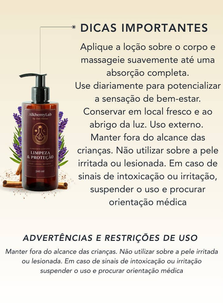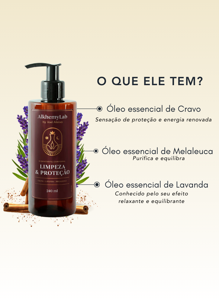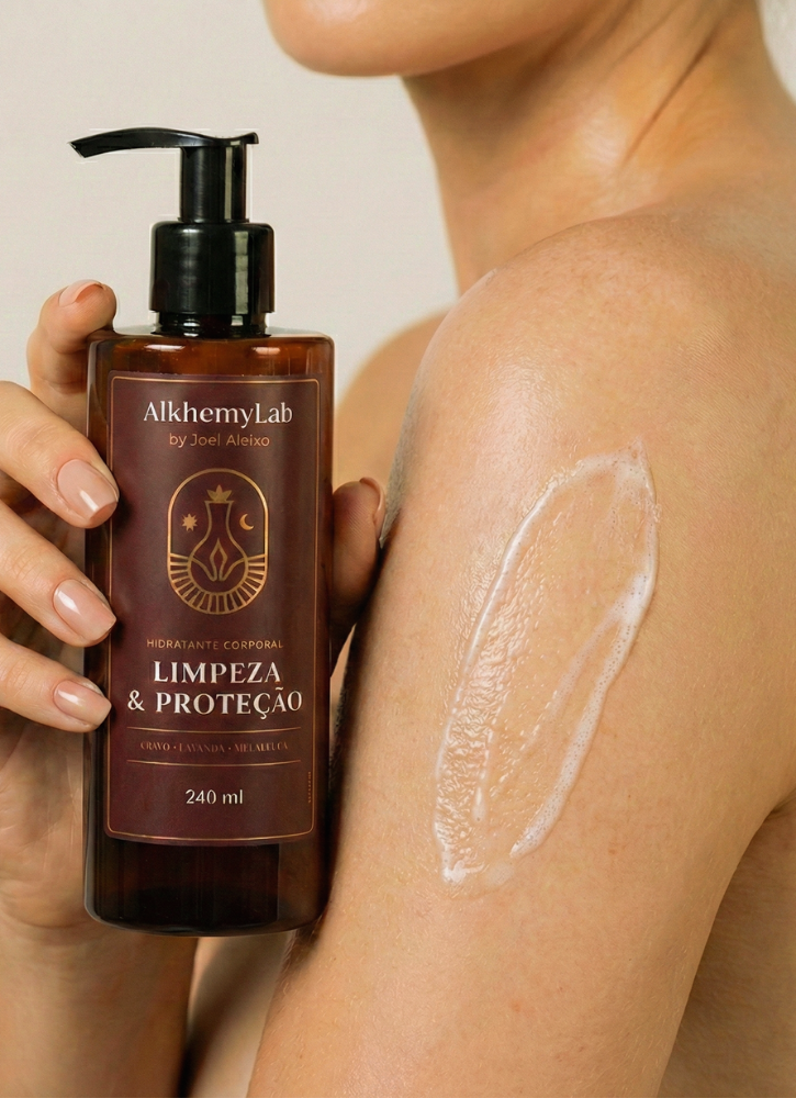 A Loção Hidratante Limpeza e Proteção Corporal da AlkhemyLab transforma seu momento de cuidado em um ritual de renovação. Com uma fórmula enriquecida por óleos essenciais 100% puros de Lavanda, Cravo e Melaleuca, hidrata a pele enquanto proporciona uma sensação de proteção e bem-estar, envolvendo você em um aroma floral suave e revigorante.