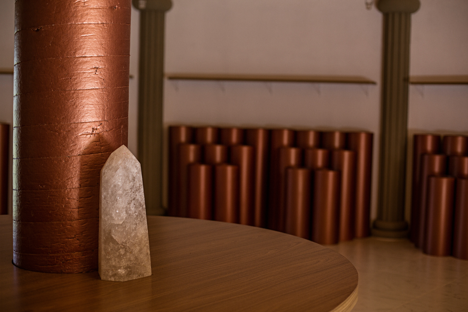 The space is also enriched with pure quartz bells and crystal bowls, which emit harmonic sound frequencies. These sounds interact with the substances in process, intensifying their energetic qualities. Violet Miron jars are used to store the essences, protecting and maintaining the vital energy of the compounds, as well as symbolic engravings that amplify their resonance.