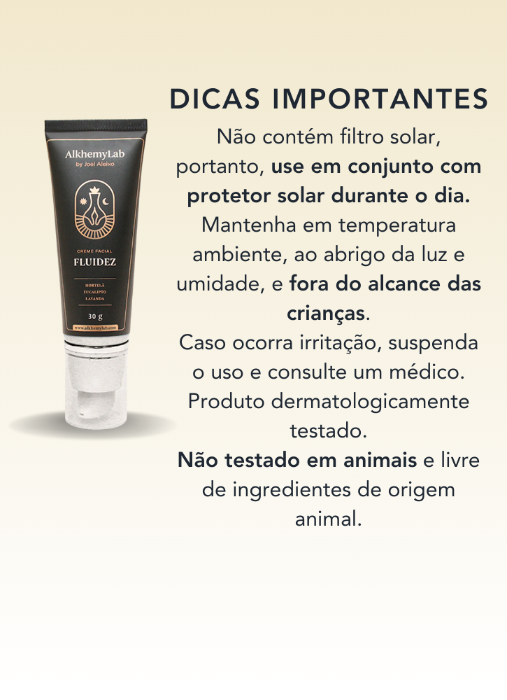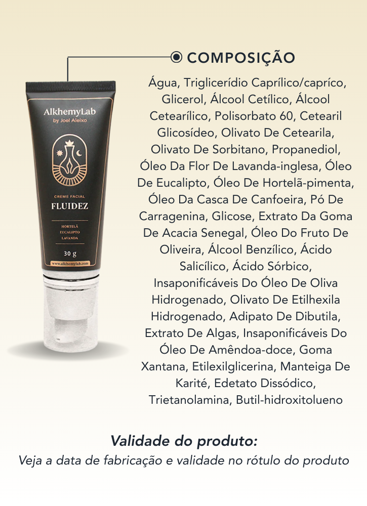 ✽ We are proud of the composition of the Fluidity Facial Cream: Water, Caprylic/Capric Triglyceride, Glycerol, Cetyl Alcohol, Cetearyl Alcohol, Polysorbate 60, Cetearyl Glucoside, Cetearyl Olivate, Sorbitan Olivate, Propanediol, English Lavender Flower Oil, Eucalyptus Oil, Peppermint Oil, Camphor Bark Oil, Carrageenan Powder, Glucose, Acacia Senegal Gum Extract, Olive Fruit Oil, Benzyl Alcohol, Salicylic Acid, Sorbic Acid, Hydrogenated Olive Oil Unsaponifiables, Hydrogenated Ethylhexyl Olivate, Dibutyl Adipate, Algae Extract, Olive Oil Unsaponifiables Sweet Almond, Xanthan Gum, Ethylhexylglycerin, Shea Butter, Disodium Edetate, Triethanolamine, Butylhydroxytoluene.
